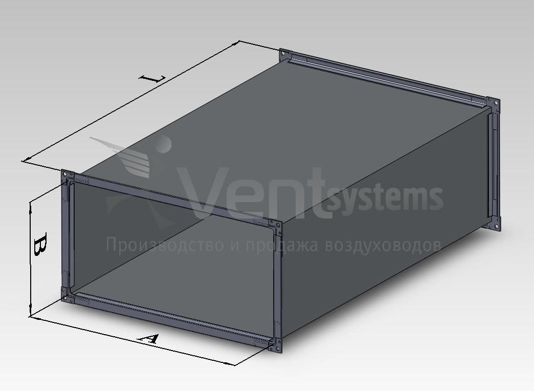 Прямоугольный воздуховод для вентиляции представляет собой короб из оцинкованной стали. Это прямой участок длиной до 1250 миллиметров. Длина и ширина сечения подбираются исходя из расчетов проекта вентиляции индивидуально для каждого конкретного случая. Соединение с соседними элементами сети осуществляется фланцевым способом. Чаще всего для изготовления воздуховодов применяется листовая сталь толщиной от 0,5 до 1 миллиметра. Чем больше размеры сечения, тем толще должны быть стенки изделия.